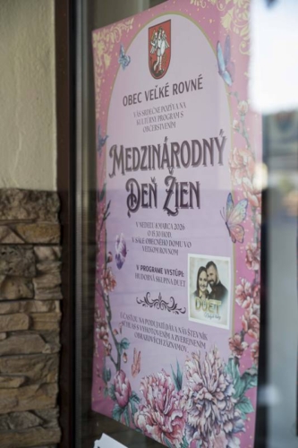 Obec Veľké Rovné Vás pri príležitosti MDŽ srdečne pozýva na kultúrny program s občerstvením, ktorý sa uskutoční v nedeľu 8.3.2026 o 15:30 hod. v sále Obecného domu Veľké Rovné.