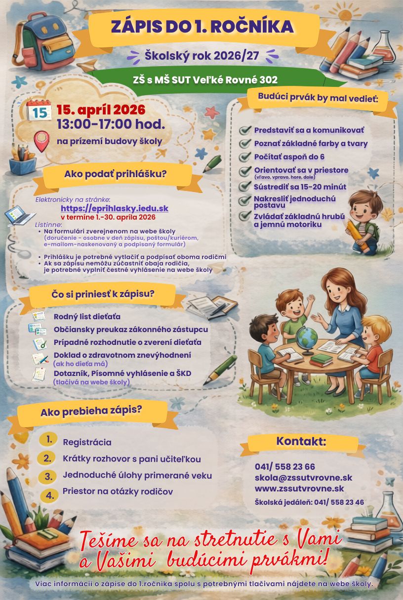 Starosta obce Veľké Rovné a riaditeľstvo ZŠ s MŠ SUT oznamuje, že zápis žiakov do 1. ročníka základnej školy sa uskutoční v stredu 15. apríla 2026 od 13:00 do 17:00 hod. v triedach na prízemí budovy ZŠ s MŠ SUT Veľké Rovné 302, 013 62 Veľké Rovné