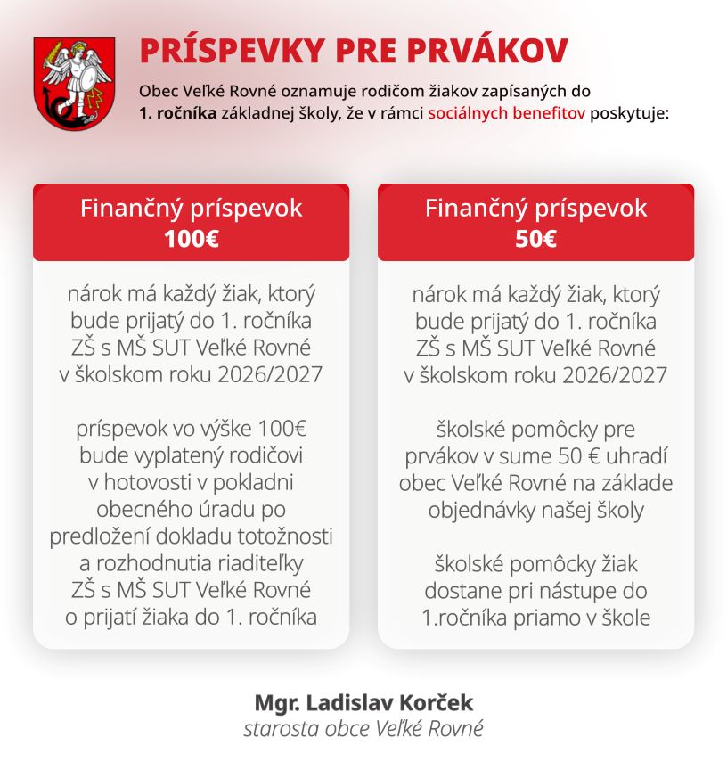 Obec Veľké Rovné oznamuje rodičom žiakov zapísaných do 1. ročníka základnej školy, že poskytuje v rámci sociálnych benefitov finančný príspevok 100 € + 50 €.