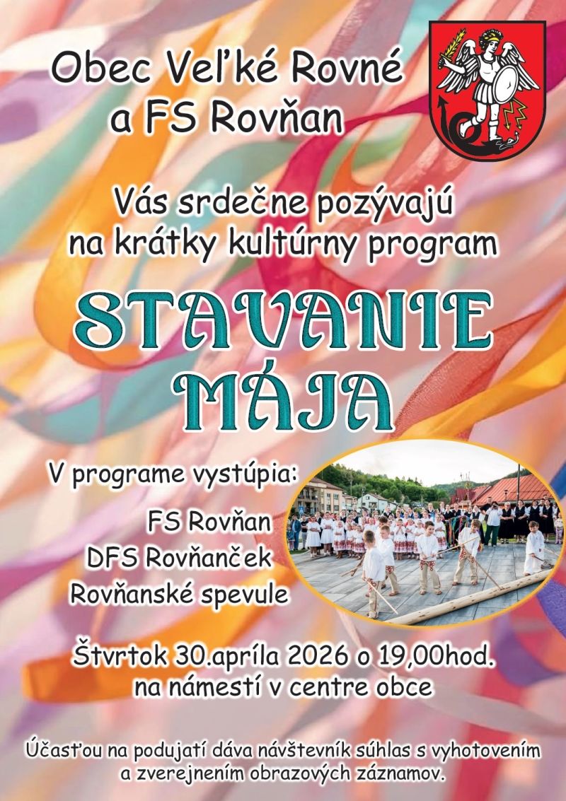 Obec Veľké Rovné a FS Rovňan Vás srdečne pozývajú na krátky kultúrny program Stavanie mája, ktorý sa uskutoční na námestí v centre obce 30.4.2026 o 19:00 hod.